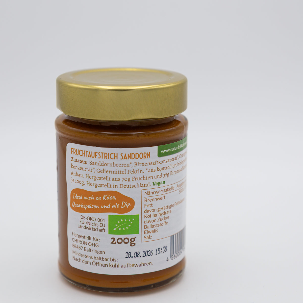 Zutaten: Sanddornbeeren*, Zucker*, Zitronensaft*, Geliermittel: Apfelpektin (*aus kontrolliert biologischem Anbau)