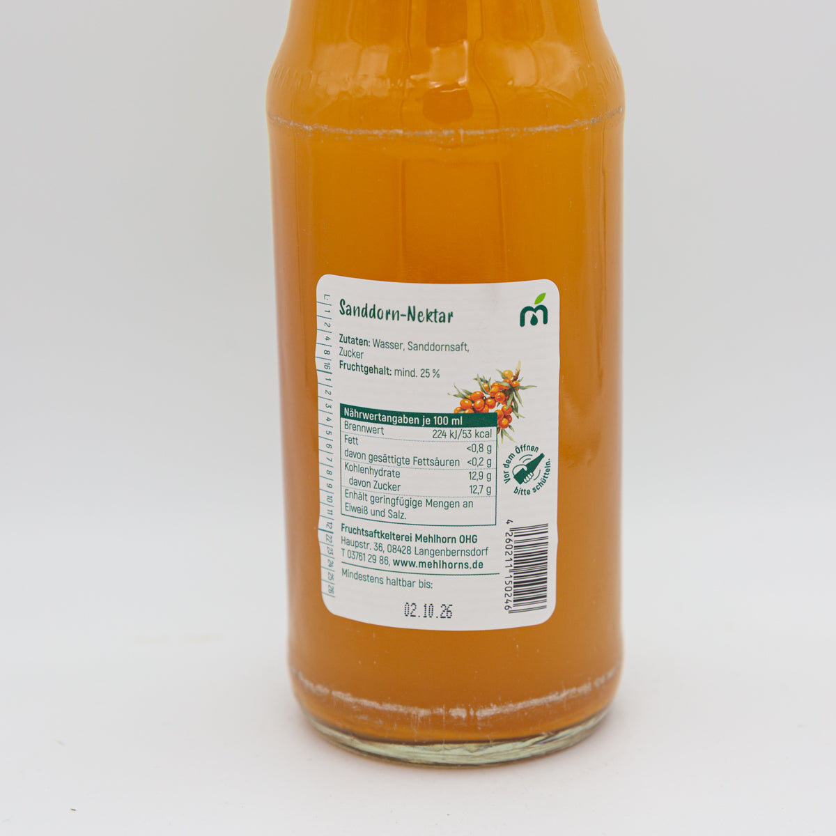 Hergestellt aus hochwertigem Sanddornsaft, mit Wasser und etwas Zucker verfeinert.